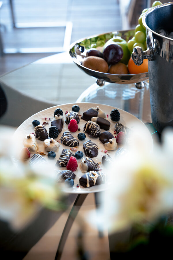 Erfreuen Sie sich an kulinarischen Köstlichkeiten, die keine Wünsche offen lassen - ohne die eigene Villa verlassen zu müssen. Sei es eine Flasche Champagner, raffinierte Pralinen oder frisches Obst: Dank unserem Room Service verbringen Sie einen wahren Genuss-Urlaub in den Geinberg5 Villen.