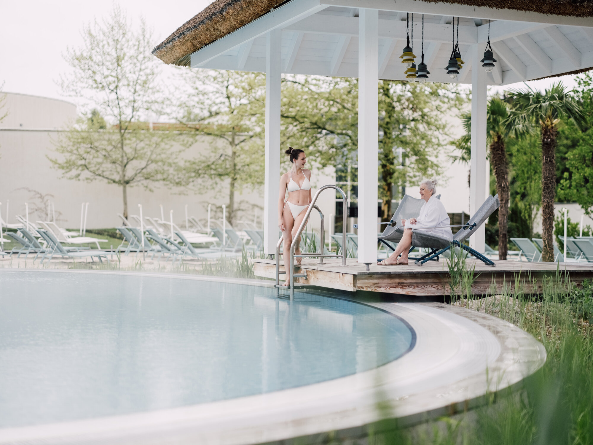- Gäste beim Pavillon der Karibischen Saunawelt im Spa Resort Geinberg