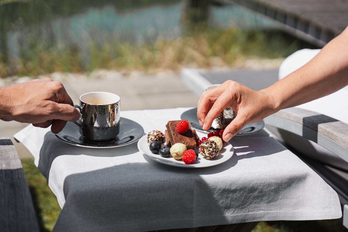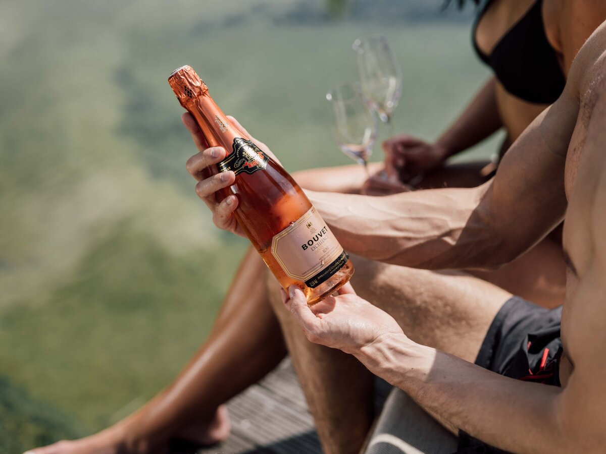 Die Krönung des Tages: Am Badesteg sitzend genießt man köstliche Süßigkeiten und eine Flasche Crémant.